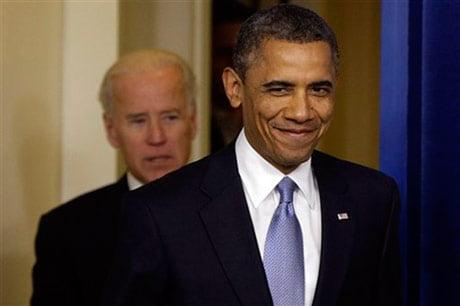 Barrack Obama Tổng thống Barrack Obama và Phó tổng thống Joe Biden sau cuộc đàm phán ngày 1/1. Ảnh: AP